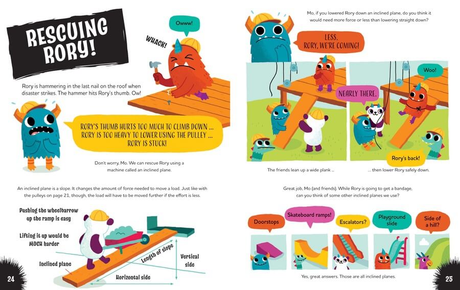 What is a machine? Kids might picture a big, complicated metal machine. But, as they learn alongside a cute blue monster named Mo, some machines are simple! Simple machines, including levers and pulleys, are highlighted in the colorful pages of this volume as readers plan, design, and build a clubhouse with Mo and friends. Illustrations of the process help readers understand simple machines and their uses, as well as other science concepts. Questions throughout the text keep readers engaged with what they are reading.